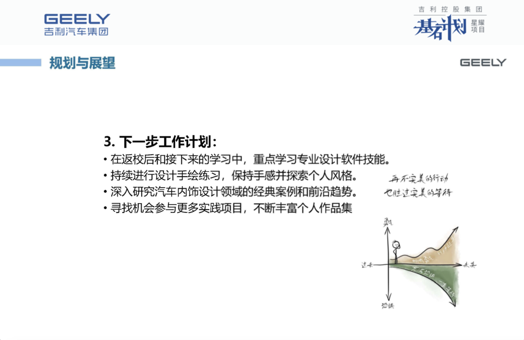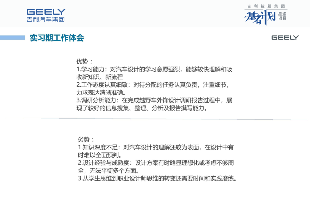 這次實(shí)習(xí)讓我接觸到真實(shí)項(xiàng)目,與一線設(shè)計(jì)師交流,深刻體會(huì)到設(shè)計(jì)是始于問題、忠于落地、將創(chuàng)意轉(zhuǎn)化為產(chǎn)品的過程。我認(rèn)識(shí)到自身不足,未來將繼續(xù)深入學(xué)習(xí),提升設(shè)計(jì)認(rèn)知與技能,為成為一名合格汽車設(shè)計(jì)師并加入吉利不斷努力。