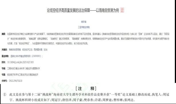 在競賽成果基礎(chǔ)上,團(tuán)隊(duì)進(jìn)一步深化研究,在《財(cái)經(jīng)理論研究》期刊上發(fā)表了《論低空經(jīng)濟(jì)高質(zhì)量發(fā)展的法治保障——以海南自貿(mào)港為例》學(xué)術(shù)論文。文章系統(tǒng)探討了低空經(jīng)濟(jì)政策與法律體系的協(xié)調(diào)路徑,提出了構(gòu)建“有限賦權(quán)”低空空域監(jiān)管制度、建立權(quán)益保障機(jī)制等創(chuàng)新建議,為海南自貿(mào)港低空經(jīng)濟(jì)立法提供了理論支撐。